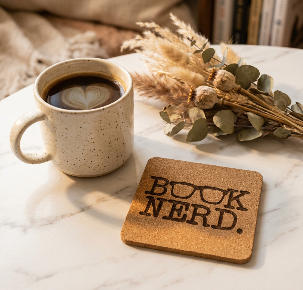 Show off your love for reading with this charming "Book Nerd" engraved square cork coaster! Made from durable natural cork, this coaster protects your surfaces while adding bookish personality to your desk, nightstand, or coffee table. Lightweight, absorbent, and easy to clean – perfect for your favorite mug of tea or coffee while you dive into your next chapter. Makes a thoughtful gift for readers, book club members, librarians, and literature lovers. Available as a single coaster or in sets.